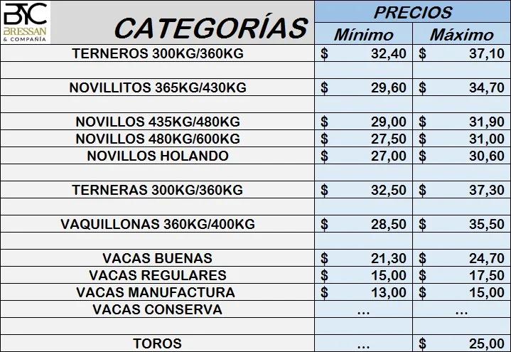 Durante la jornada de hoy fue realizado el remate semanal de hacienda gorda de Bressan y Compañía en la ciudad de Río Cuarto con más de 500 vacunos. A continuación les dejamos el detalle de los valores obtenidos. PRECIOS CATEGORÍAS Mínimo Máximo TERNEROS 300KG/360KG $ 30,00 $ 34,00 NOVILLITOS […]