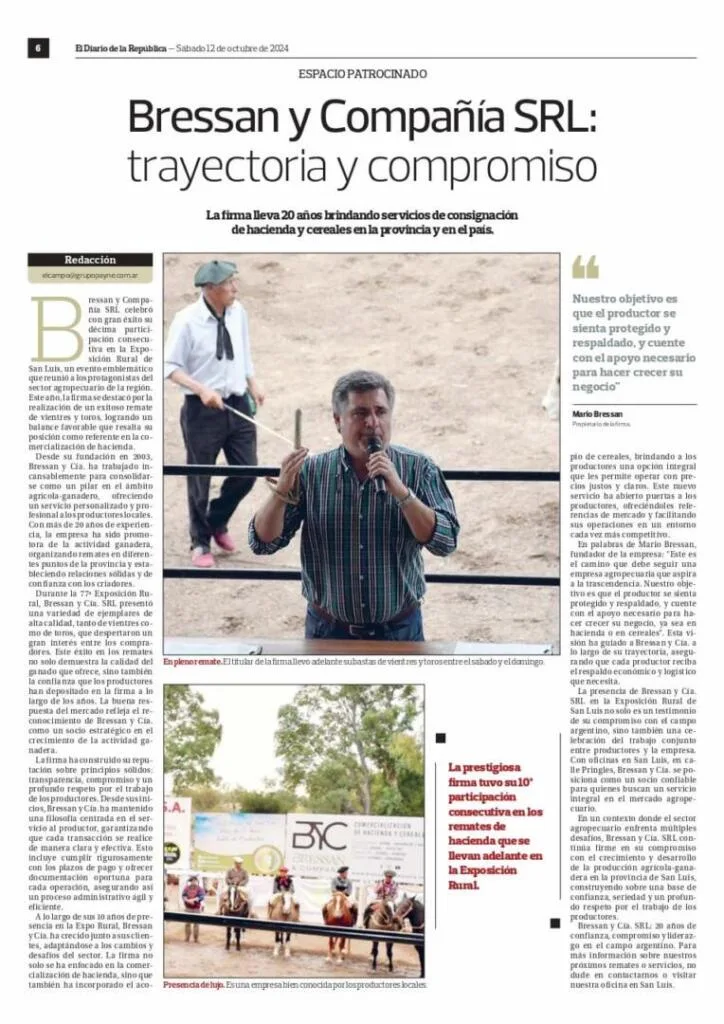 La firma lleva 20 años brindando servicios de consignación de hacienda y cereales en la provincia y en el país. Redacción: elcampo@grupopayne.com.ar Bressan y Compañía SRL celebró con gran éxito su décima participación consecutiva en la Exposición Rural de San Luis, un evento emblemático que reúne a los protagonistas del sector agropecuario de la región. […]